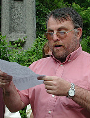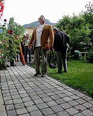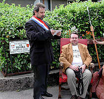 de Michel Duret (voir la photo ci-dessus), Patrick Duc, représentant la Ville de Faverges, (et dont le jean a été remplacé dans les photos par un élégant pantalon noir) prononce un bref discours. Jacques siège dans le fauteuil aimablement prêté par Silvain Mouthon, antiquaire de son état. |